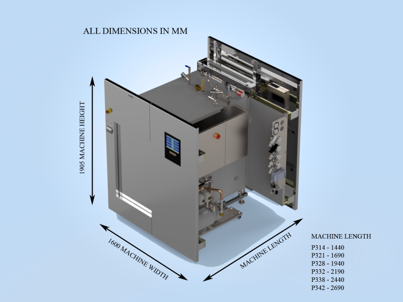 Horizontal sliding door | Single Ended | Double Ended (double door) | Barrier seal available | Integral steam generator available | Overall width & height (mm) | Overall length (mm) |